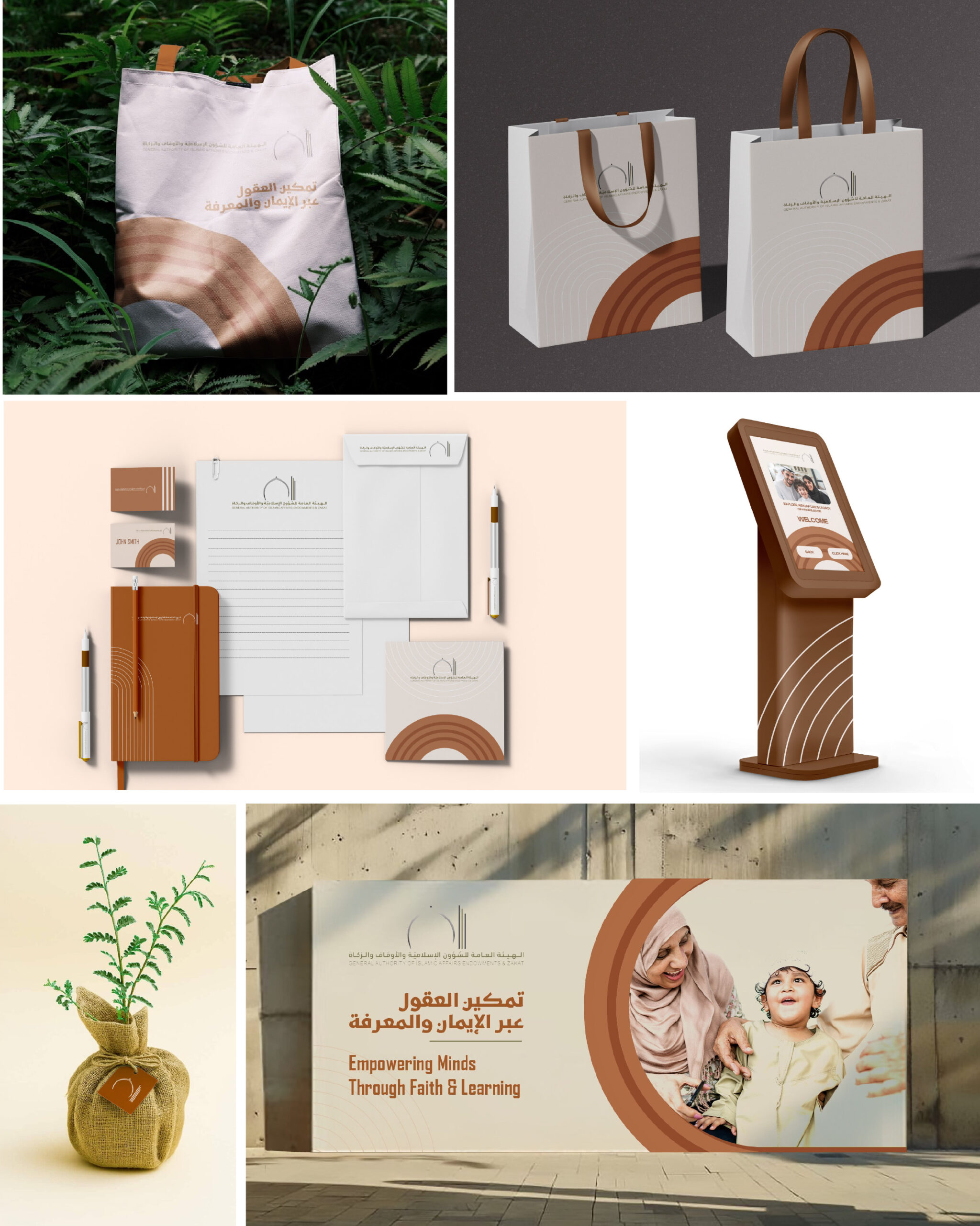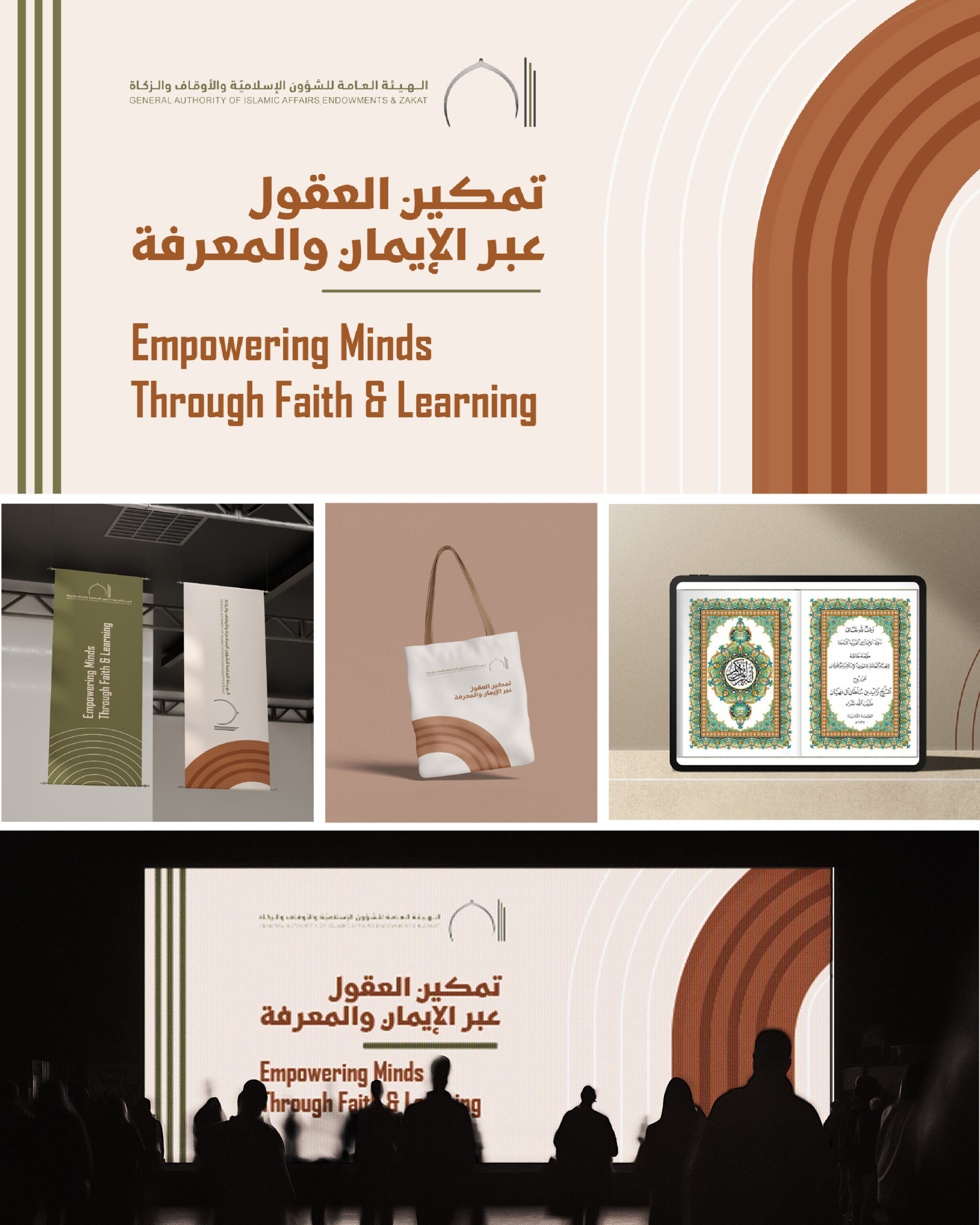 For this project, I developed a serene and spiritually grounded visual identity for the General Authority of Islamic Affairs, Endowments & Zakat. The design language uses a refined palette of deep emerald greens, warm golds, and soft sand tones, integrated with intricate Islamic geometric patterns that symbolize growth and heritage. This cohesive system was applied across a comprehensive range of touchpoints—from digital welcome screens and mobile application interfaces to physical environmental elements like custom-built reception desks and ornamental exhibition backdrops—to create a unified and modern brand experience.